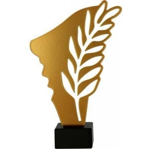 Kuldne metallist (paksus 2 mm) ja graniidist universaalne auhind on 21 cm kõrge. Tekstiga silt auhinnajalal sisaldub hinnas (logo, foto, tekst...).Hind koos käibemaksuga.