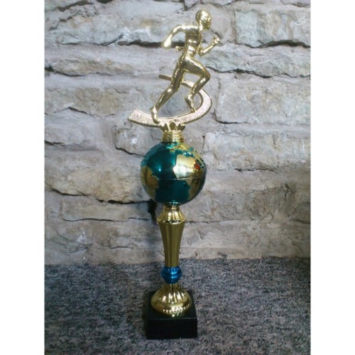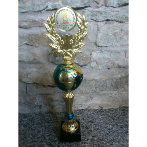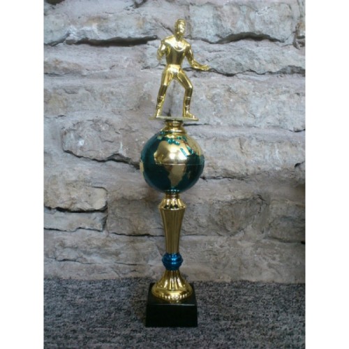 Vahva sinine-kuldne maakera karikas, millele lisatakse teile vajalik spordialakuju või trükitud plaat pärja peal. Karika kõrgus ilma kujuta 24 cm / maakera läbimõõt 8 cm.