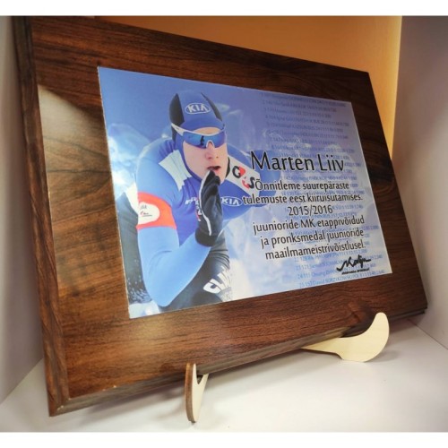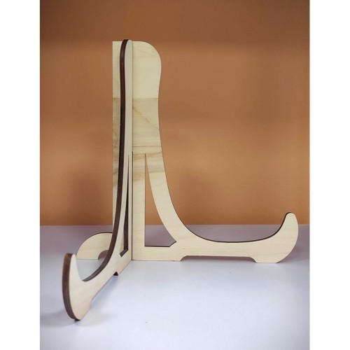 Puidust plaadi/taldriku hoidja. Kõrgus on 16,5 cm ning laius 17 cm.