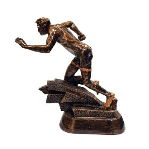 Pronksine jooksja auhind on 16,5 cm kõrge. Tekstiga metallplaat auhinnajalal sisaldub hinnas (logo, foto, tekst...).Hind koos käibemaksuga.